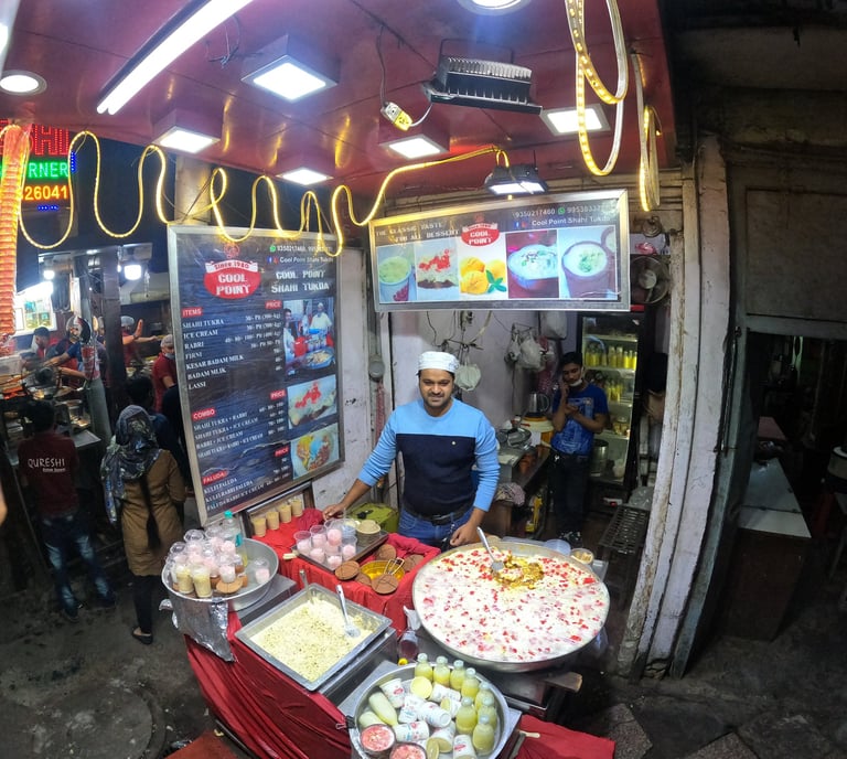 Cool Point Shahi Tukda was established in 1960 by our beloved Grandfather Abdul Sattar, now their third generation is taking forward his legacy by continuing his business and his zeal of preserving and promoting the richness of this ancient desert which has its roots connected with the history of Shahjahanabad. The current old Delhi which was also known as Shajhanabad due to the capital of the emperor Shahjahan, Shahi Tukda was one of the favorite sweet dishes. The Shah Jahan’s Dastarkhwan (Dining table) was incomplete without the presence of Shahi Tukda. Hence, this traditional and delicious dish holds its essence within and beyond the walled city till now.Apart from the Mughal's contribution to architecture and 400 years long culture, the Shahi Tukda is also called the Mughlai Shahi Tukda, and as the name suggests Shahi means Royal, enduring its ancestries with the richness of royalty. Some say that the dish traveled with Babur within the sixteenth century, whereas some say it might somewhat be a desi fight the bread pudding that was well-liked across central Asia and continent within the medieval times, brought home by Babur and his organization. Another piece of history says that instead of discard leftover bread,the Mughal Khansamas came up with an explicit plan of cooking it by preparing the loaf in drawn butter and high it with a creamy and delicious delight of milk and aromatic flavors of saffron, cardamom, and essence. fancy with a bit of dry fruits like almonds pistachios, cashewsand embellished with silver or gold varq.